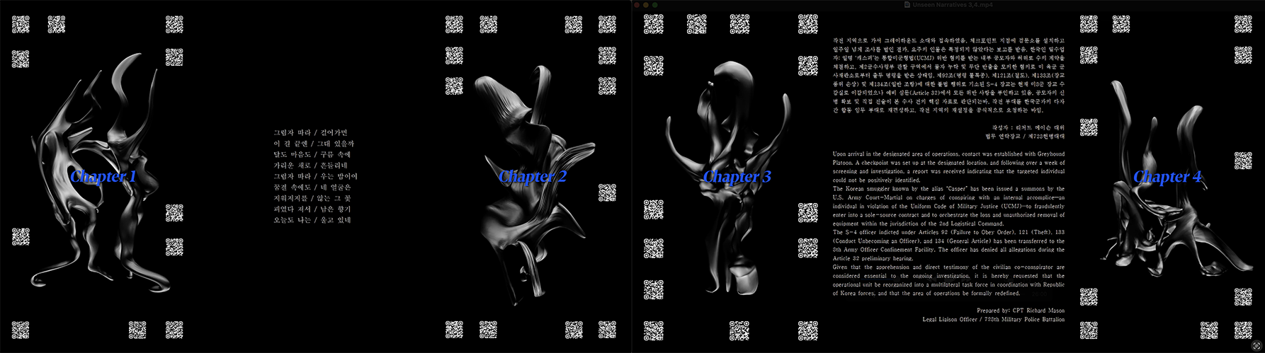 In collaboration with novelist Jongwon Shin, the single-channel video series Unseen Narratives(2025) metaphorically captures anonymous lives absorbed and erased within the repetitive cycles of history. The text appears on an electronic message display suspended from the ceiling, recalling those found in public spaces. If Casper resides on the floor and anonymity hangs above, at the viewer’s eye level is Fragments of Memory(2025), a video interview in which the artist’s mother recounts her father’s story. Lijung regards those who have disappeared—likened to Casper—not as heroes or villains, but simply as “survivors.” Rather than restoring historical memory from archival remnants, she invites viewers to confront the void, to linger within it, and to gently touch the traces that remain.