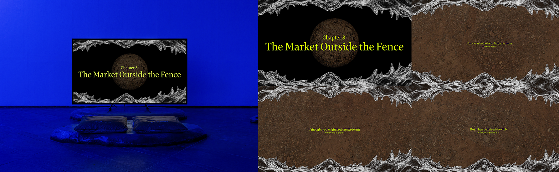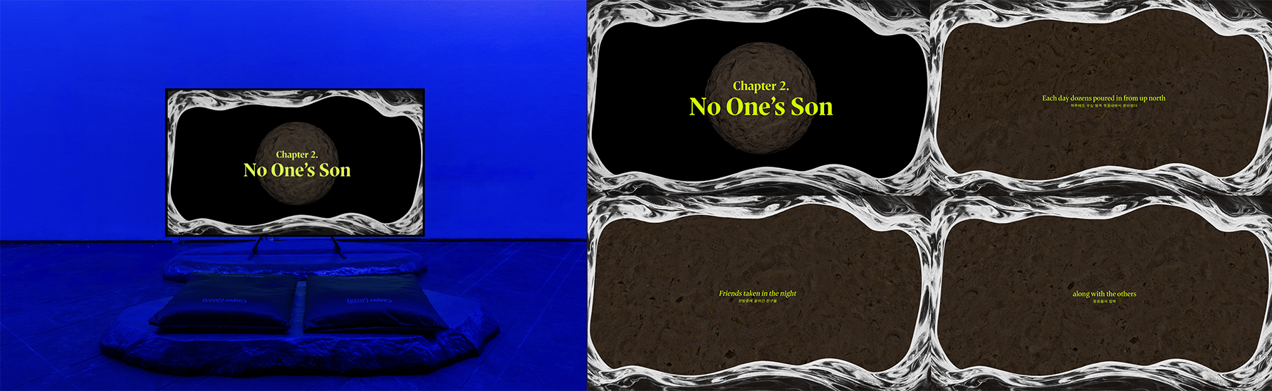 On the first floor, the single-channel video Ghost Without a Grave(2025) functions as a symbolic axis of the exhibition. Conceived as a digital cemetery commemorating those laid to rest without gravestones, it presents the artist’s poetry honoring the nameless, accompanied by sound composed by Eunsil Noh. Here, the gallery becomes a shelter for those who had nothing, a starting point for the wish that “may their untold stories find breath here, at last.”