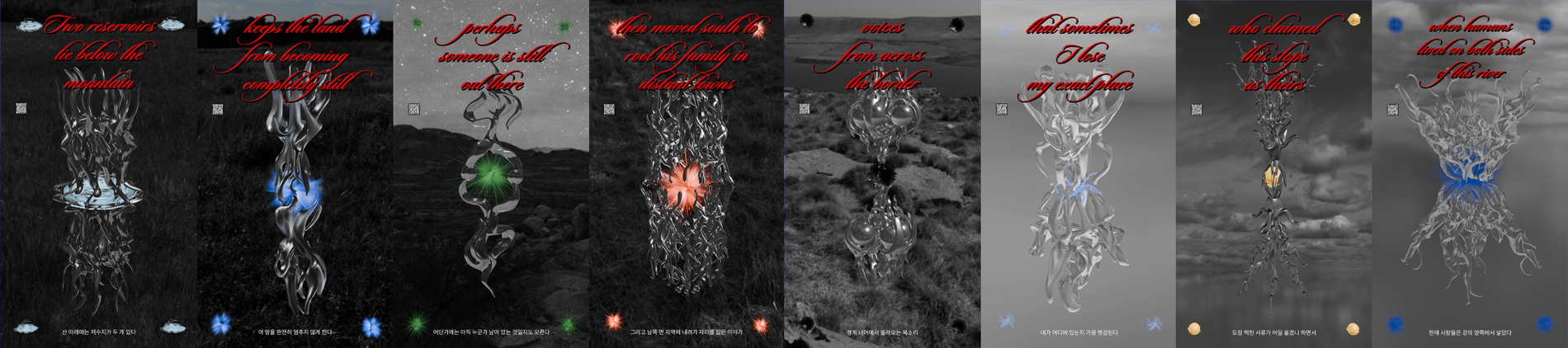 8 Lands, 8 Keepers does not bind the DMZ into a single grand narrative. Instead, it approaches the area as eight distinct plots of land, each with different locations, conditions, and forms of narration. None of these lands is reduced to a unified story, and in response, each is accompanied by a single “keeper.” These keepers are not mythological beings or defined characters, but provisional forms shaped by the time and memory accumulated in the land, and by the traces left by human language. They do not own or represent the land. They simply remain as presences that continue to hold the land in place where human access has ceased. The narration functions less as explanation than as monologue, flowing from the keeper’s perspective. What is spoken is not information, but residual sensations and emotions lingering in that place.